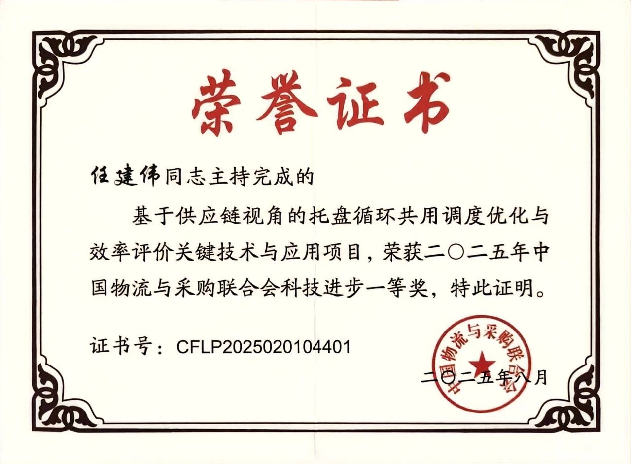 近日,中國物流與采購聯(lián)合會(CFLP)正式公布了2025年度科學(xué)技術(shù)獎(jiǎng)評審結(jié)果。我院任建偉教授團(tuán)隊(duì)的研究成果“基于供應(yīng)鏈視角的托盤循環(huán)共用調(diào)度優(yōu)化與效率評價(jià)關(guān)鍵技術(shù)與應(yīng)用”榮獲科技進(jìn)步獎(jiǎng)一等獎(jiǎng)。成果主要完成人:任建偉、李成兵、陳春花、孫哲、徐鐵、李一川、閆振英、霍月英、張鵬、魏中華、喬曉波。